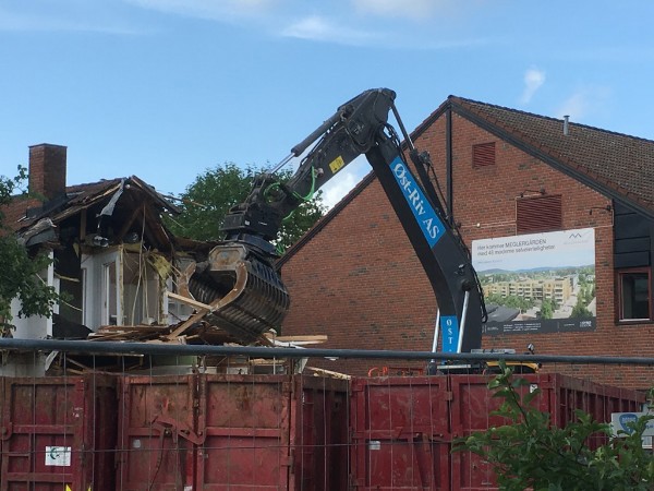For den som er i tvil – det skal fortsatt både rives og bygges på Bekkestua. Rivingen av gamle Meglergården er i gang.