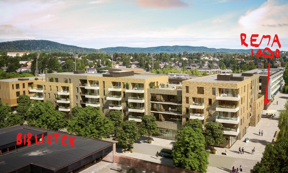 Det som rives er det gamle trehuset og murbygningen som ligger mellom REMA 1000 og biblioteket. Her skal det komme en blokk, og så skal COOP MEGA-butikken flytte til første etasje. Eksisterende COOP-bygning, som strengt tatt ikke er så veldig pen, skal da på sikt rives og erstattes med et nytt bygg. Det er også planlagt en bedre trafikkløsning, og det kan være på sin plass. Dagens uoversiktelige miks av parkeringsplass, biltrafikk, syklende og gående er ikke god. Blant annet går skoleveien til mange av elevene på den internasjonale skolen over den nåværende parkeringsplassen ved COOP MEGA.