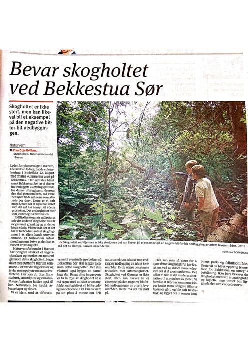 Bevar skogholtet ved Bekkestua Sør, sier Naturvernforbundet i Bærum i et innlegg i Budstikka. Naturvernforbundets styremedlem Finn Otto Kvillum gir en god beskrivelse av den lille skogen mellom Kleivveien og Bærumsveien, i sørenden av Bekkestuajordet. Naturvernforbundet foreslår ingen gjenbygging, men derimot en park på Bekkestuajordet.