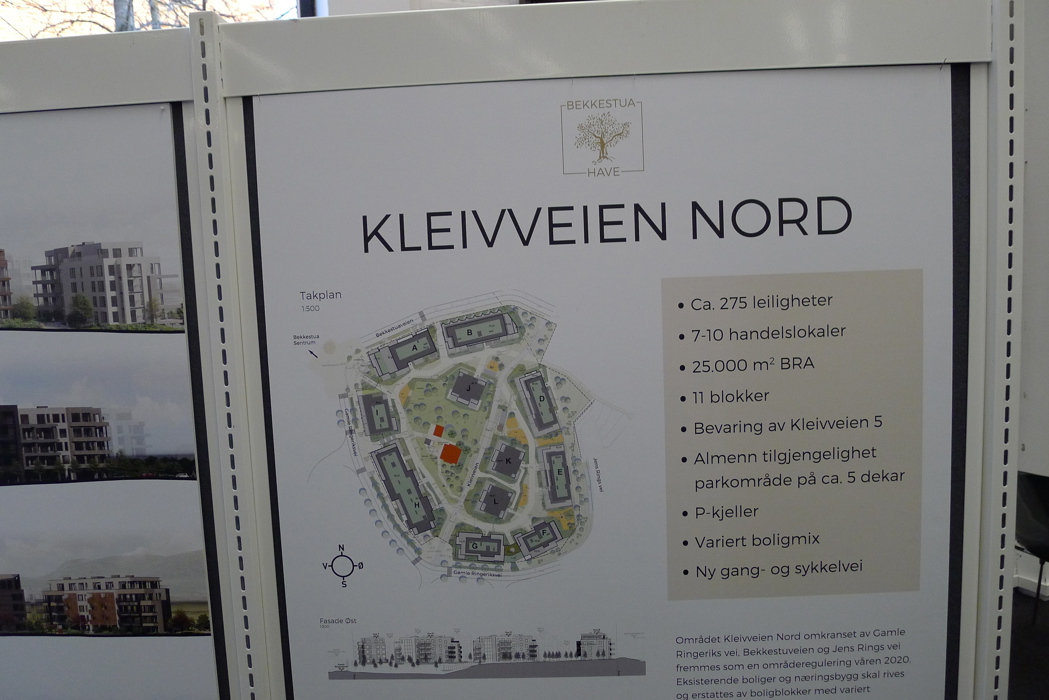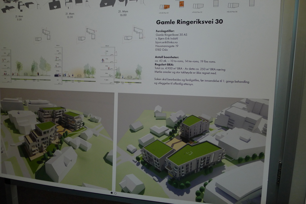 Kommunen fikk fantastisk oppmøte på sin åpne dag på Bekkestua bibliotek i går. Da vi var der klokka 16 var lokalet dominert av folk med fremtiden bak seg. Vi får tro at de med fremtiden foran seg kom senere på kvelden eller følger med på annen måte. Og vi må skryte av kommunen, det er positivt å vise fram hva man arbeider med på denne måten. De la også opp til at folk kunne legge igjen kommentarer. Det var også informativt å se planene for «Kleivveien Nord», en liten by med 11 blokker og 275 leiligheter. Kleivveien Nord er på motsatt side av gata ved Bekkestua Senter. Se bilde lenger ned. Et annet prosjekt var «Gamle Ringeriksvei 30», der det i dag står en gul hundematbutikk med stor plen bak. Der skal de greie å få inn tre blokker og 43 leiligheter. Se bilde lenger ned. Det er ganske utrolig hvor mange leiligheter man får plass til ved å rive småhus og bebygge hustomt og hage med blokker.