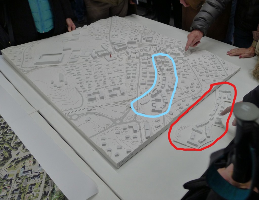 I modellen av området velger kommunen da å vise to alternativer. «Småhus-alternativet» har selvsagt utelukkende rekkehus, og hvert eneste hus på maksimal høyde 3. etasjer, som tilsvarer 9 meter. Rekkehusene står tett i tett som brede vegger, tilsynelatende med lite grønt, men sikkert i tråd med en eller annet krav om utnyttelsesgrad. Det ble også vist fram et blokkalternativ, og da virket ikke så veldig mye tettere og høyere enn det litt vulgære «småhusalternativet» som man opererer med. Se bilder nederst i artikkel.