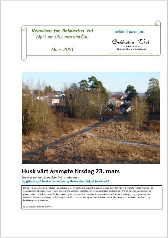 Velavisen ligger som pdf-fil nederst på denne siden. Og når det gjelder vårt digitale årsmøte - meld deg på ved å sende mail til bekkestuavelforening@gmail.com. Vi snakkes!