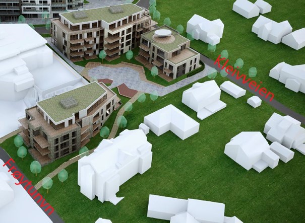Som velforeningen ser det så lever ikke utbyggers seneste forslag opp til dette. Antall etasjer er en ting. Det må også tas hensyn til de totale kotehøydene, og hvordan prosjektet som helhet ruver på en høyde i terrenget. Der vi hadde forventet et veltilpasset prosjekt, med en harmonisk nedtrapping mot småhusbebyggelse, ser vi en ruvende vegg som skjærer mot horisonten når du kommer gående opp Kleivveien og Frøytunveien. Det største bygget har fem etasjer i retning vest mot småhusbebyggelsen. Videre legges det opp til at bygget mot Gamle Ringeriksvei ruver høyere enn nabobygget mot Bekkestua sentrum. Vi mener det blir både feil og vulgært når man i utkanten av Bekkestua sentrum legger opp til en slik opptrapping av høyder når man nærmer seg småhusområdene. Dersom man fjerner nest øverste etasje på alle tre byggene vil det være mer i tråd med reguleringsbestemmelsens paragraf 1.2. som planutvalget enstemmig har vedtatt: Planen skal sikre/legge vekt på…-avtrappede bygningsvolumer som danner en naturlig overgang mellom sentrums- og småhusbebyggelsen. Vi håper planutvalget er i stand til å se det samme som oss. Planene i dag er ikke tilpasset eksisterende bebyggelse og bomiljø.