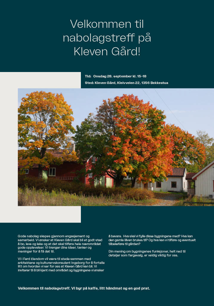 Ferd Eiendom, som skal bygge ut området rundt Kleven Gård, inviterer alle i nabolaget til gården onsdag 28. sept kl 15-18. De vil fortelle om sine planer, og de ønsker også å høre hva vi naboer mener - særlig om hva låven skal brukes til. Uansett hva man måtte mene om utbyggingen, det kan sikkert være greit å ta en tur bort!